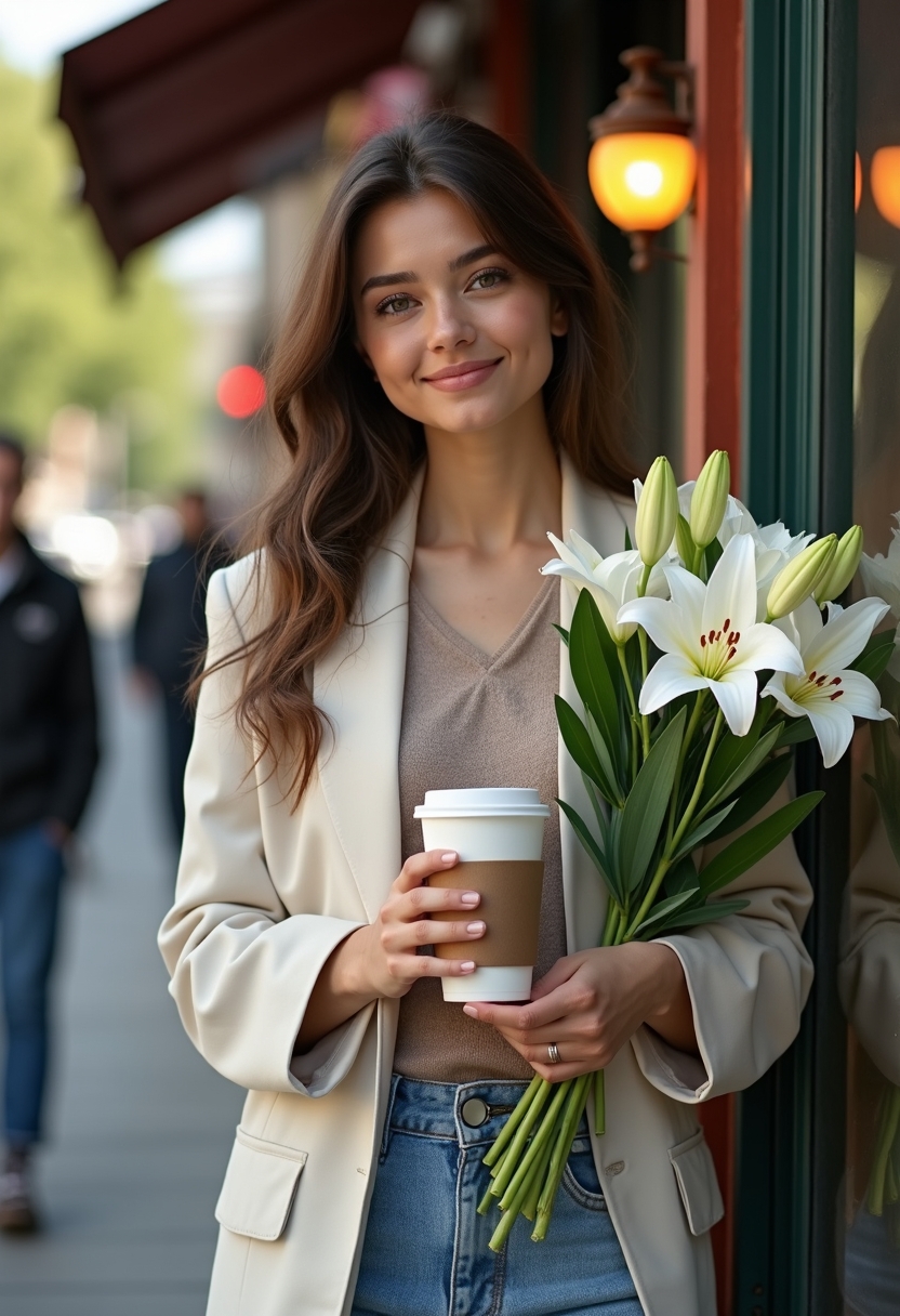 Алматыдағы Арбатта әйел кофе ұстаған күйде қасындағы гүл сататын дүкеннің жанында тұр. Ол оверсайз пиджак пен кең джинсы киіп, қолында ақ лалагүлдер шоғы бар. Камераға қараған көзқарасы жайдары, артқы фон – көктемгі қала өмірінің көрінісі.