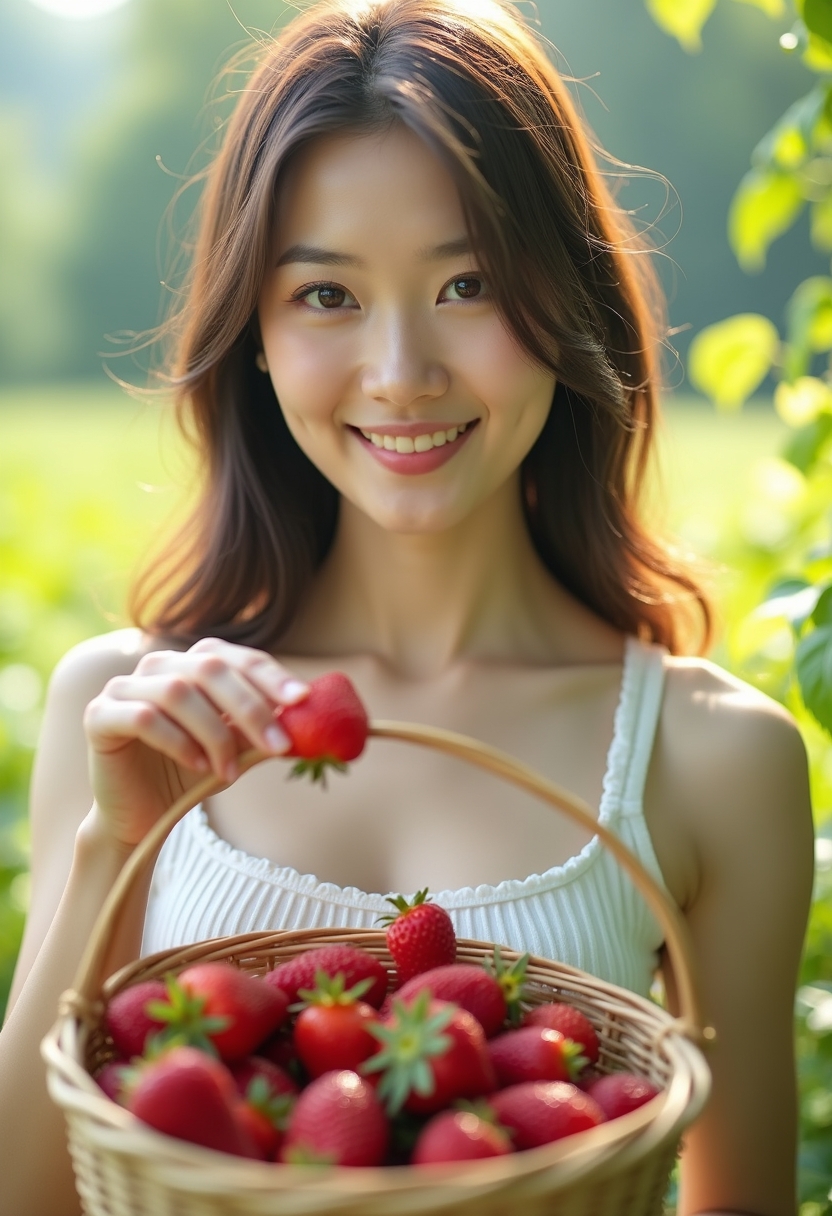 Ақ белдемше мен қысқа топ киген әйел қолында құлпынай салынған себет ұстап, саусақтарымен жидектерді іріктеп тұр. Ол камераға жымиып қарап тұр, артында бұлдыр алқаптар мен жапырақ арасынан күн сәулесі көрініп тұр. Жақын жоспар, жазғы балғындық пен жеңілдікті көрсетеді.
