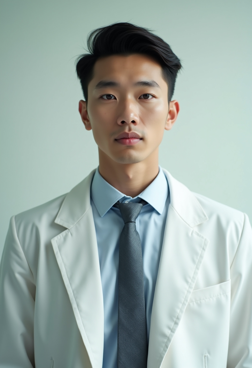 Ақ халат киген ер дәрігер, байсалды жүзбен, ашық көк градиентті фонда ірі жоспар, тура камераға қарап тұр.
