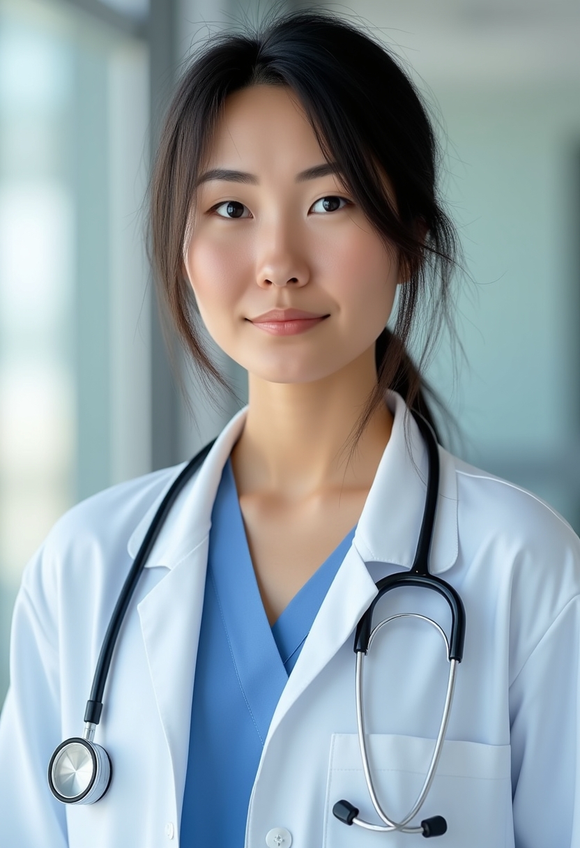 Ақ халат пен жеңіл макияжбен кәсіби көрінетін әйел-дәрігер, мойнында стетоскоп, жылы студиялық жарық аясында, тура камераға қарап тұр.