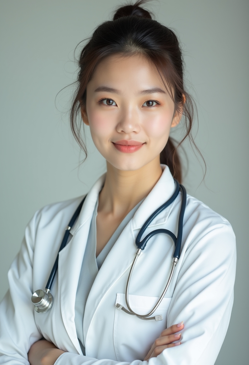 Медициналық форма киген әйел-дәрігер, минималды макияжбен және сенімді көзқараспен, ашық сұр фонда ірі жоспар, тура камераға қарап тұр. Басында цилиндр пішінді ақ қалпақ
