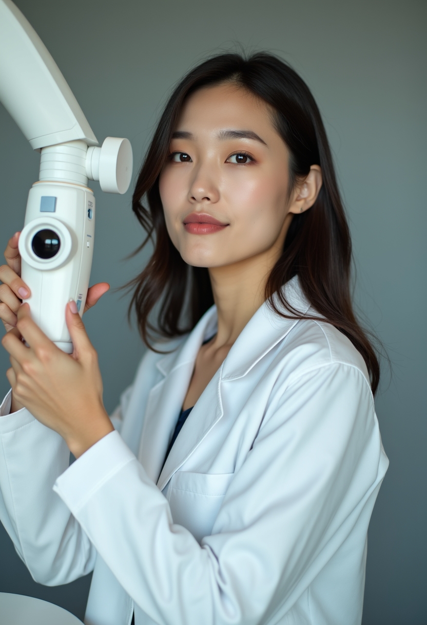 Ақ халаттағы косметолог теріні талдау құралын ұстап тұр, диагностикалық аппараттың жанында, тура камераға қарап тұр.