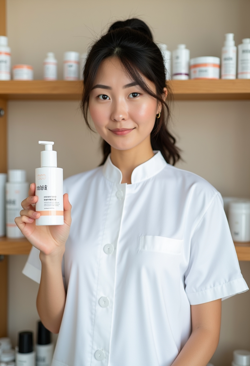 Ақ медициналық формадағы әйел тері күтімі құралын көрсетіп тұр, артында косметикалық сөрелер, тура камераға қарап тұр.