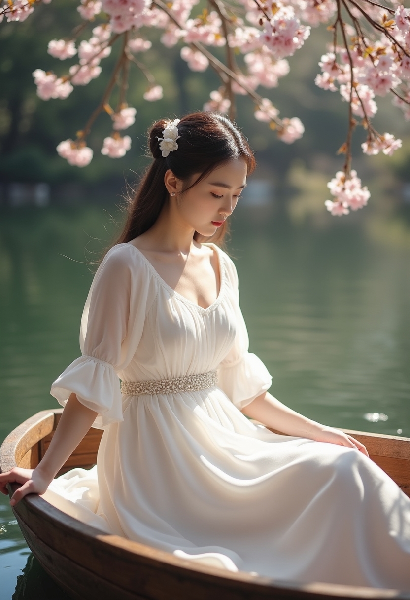 Ақ меруерт көйлек киген әйел гүлдеген ағаштар қоршаған көлдің үстінде жүзіп бара жатқан ағаш қайықта отыр. Ол төмен қарап, қолымен суды жеңіл сипап тұр. Артында судың бетінде ағаштардың шағылысуы көрінеді. Жарық жұмсақ, екпін оның романтикалық бейнесіне қойылған.
