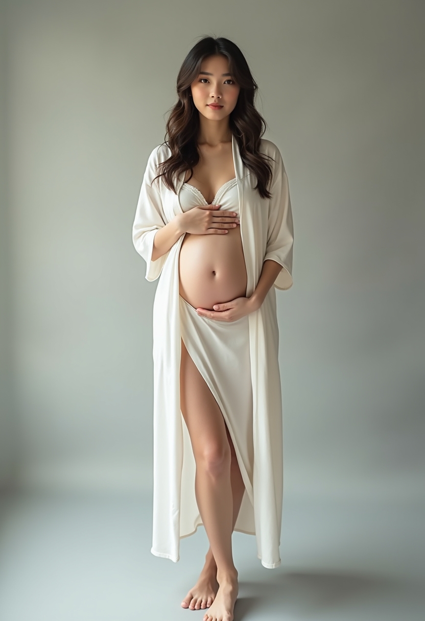 Ақ жібек халат киген жүкті әйел жарық-сұр қабырға фонында жалаңаяқ тұр. Ол ішін жұмсақ сипап, тура камераға қарайды. Жылы, қарсы жарық оның терісінің нәзіктігін және дөңгелек пішінін ерекшелейді. Үлкен кадр, іш жарық көлеңкемен айқындалған.