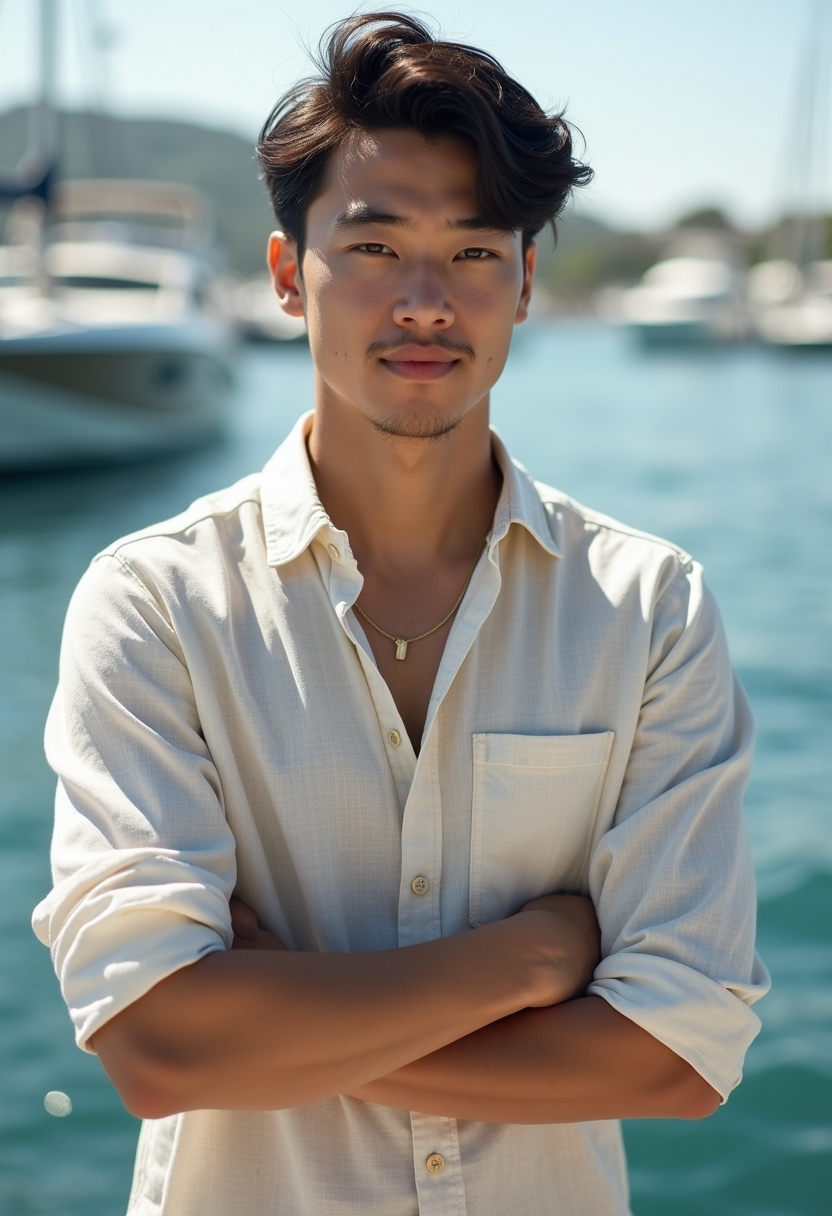 Ақ зығыр көйлек киіп, жеңін түріп қойған ер адам айлақта тұр, қолы кеудесінде айқасқан, ал көзі алыста. Артында күн сәулесін шағылыстырған яхталар мен теңіз толқындары. Жақын жоспар, стиль мен жазғы еркіндікті айқындайды.
