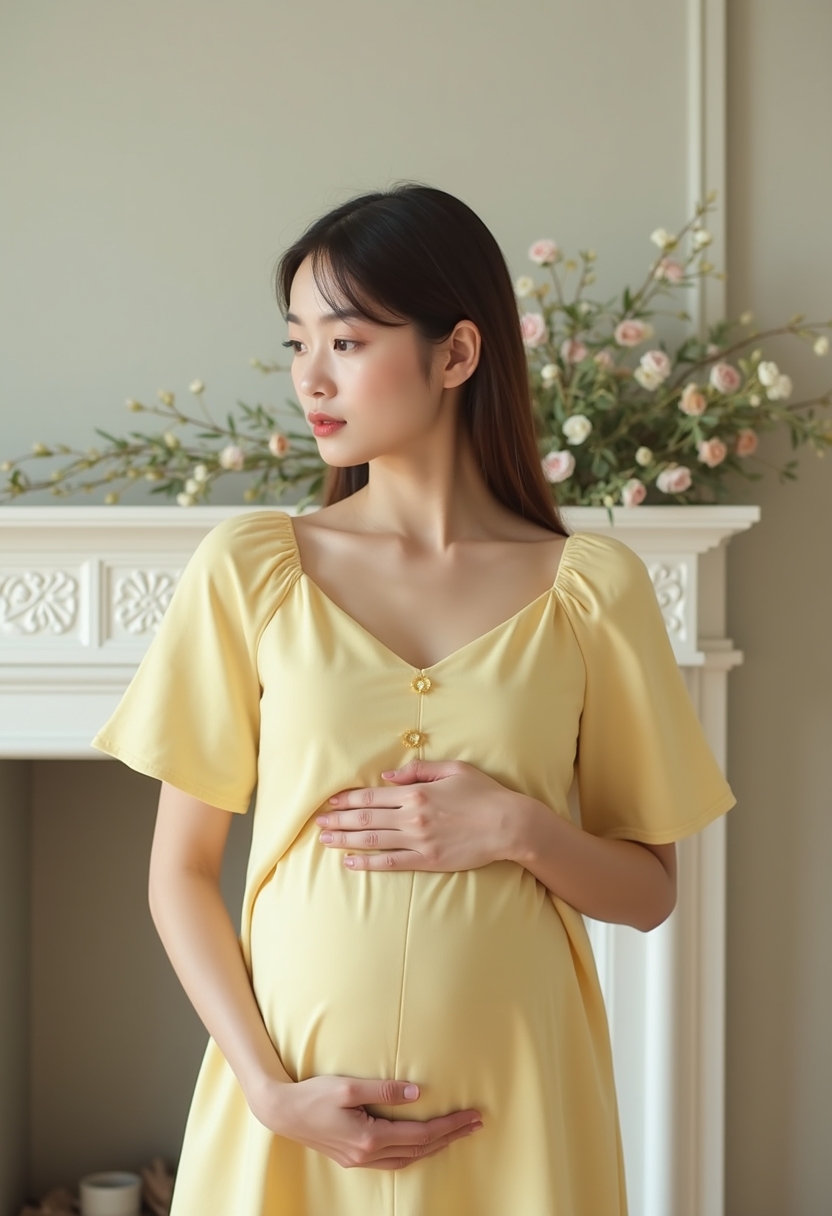 Ақшыл-сарғыш түстес көйлек киген жүкті әйел минималистік қабырға алдында тұр, басын сәл еңкейткен. Ол ішін қолдарымен ұстап, сабырлы көзқараспен қарайды. Артында гүлді элементтері бар ақ декоративті камин көрінеді. Жылы жарық, екпін жайлылық пен нәзіктікте.
