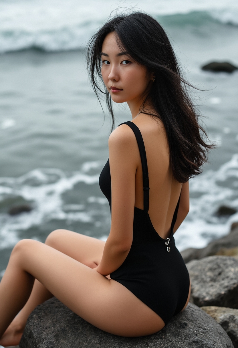 Ашық арқасы бар қара тұтас купальник киген әйел теңіз жағасындағы жартаста отыр, оның бейнесін айқындайды. Ол алысты көздейді, шашы теңіз самалынан сәл дымқыл. Артында көбікті толқындар жартастарға соғылып жатыр. Жақын план, нәзіктік пен тыныштыққа екпін жасалған.