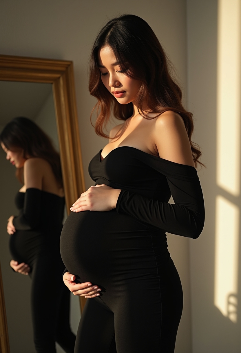 Ашық иықты қара тар көйлек киген жүкті әйел алтын жиектелген үлкен айнаның жанында тұр. Ол қолдарын ішіне жайлап қойып, төмен қарайды. Артында минималистік студия интерьері жұмсақ жарықпен көрінеді. Контрастты жарық, екпін силуэт пен элеганттылықта.