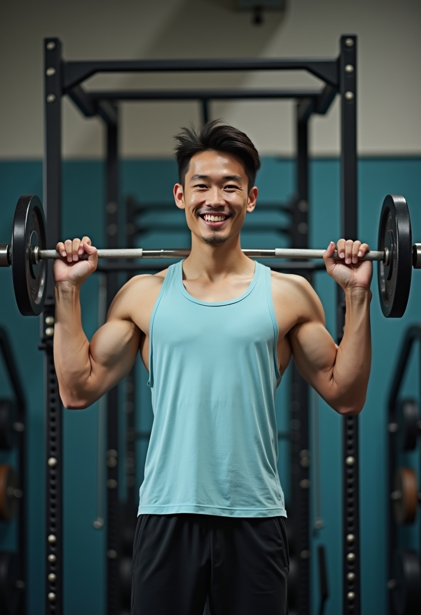 Ашық көк майка мен қара шорты киген ер адам иығында ауыр штанганы ұстап, функционалды жаттығу залында поза көрсетіп тұр. Ол камераға сенімді жымиып қарайды. Артында отырып тұруға арналған тірек пен басқа спорт жабдықтары көрінеді. Жарық жұмсақ, екпін оның физикалық пішініне қойылған.