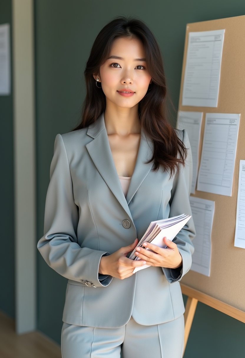 Ашық сұр шалбарлы костюм киген әйел тақта жанында тұр, қолында дәптерлер жинағы. Ол камераға байыпты, жинақы кейіппен қарайды. Жақын жоспар, ұқыптылық пен талапшылдықты бейнелейді.