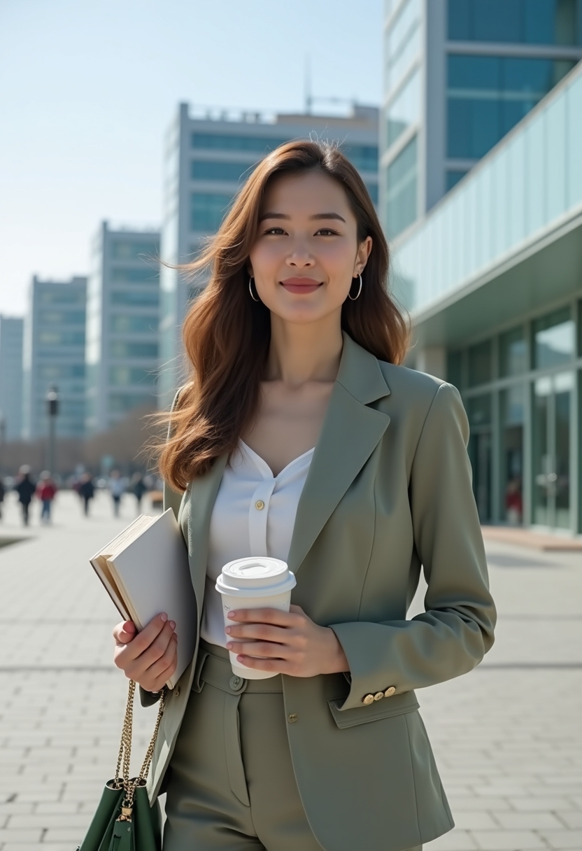 Астанадағы Хан Шатыр сауда орталығының жанында әйел ашық түсті классикалық костюм киіп, стильді бейнеде тұр. Ол қолына кітап пен кофе ұстап, камераға қарап жымиып тұр. Артқы фонда футуристік ғимараттар мен ашық аспан қала өмірінің заманауи стилін көрсетеді.