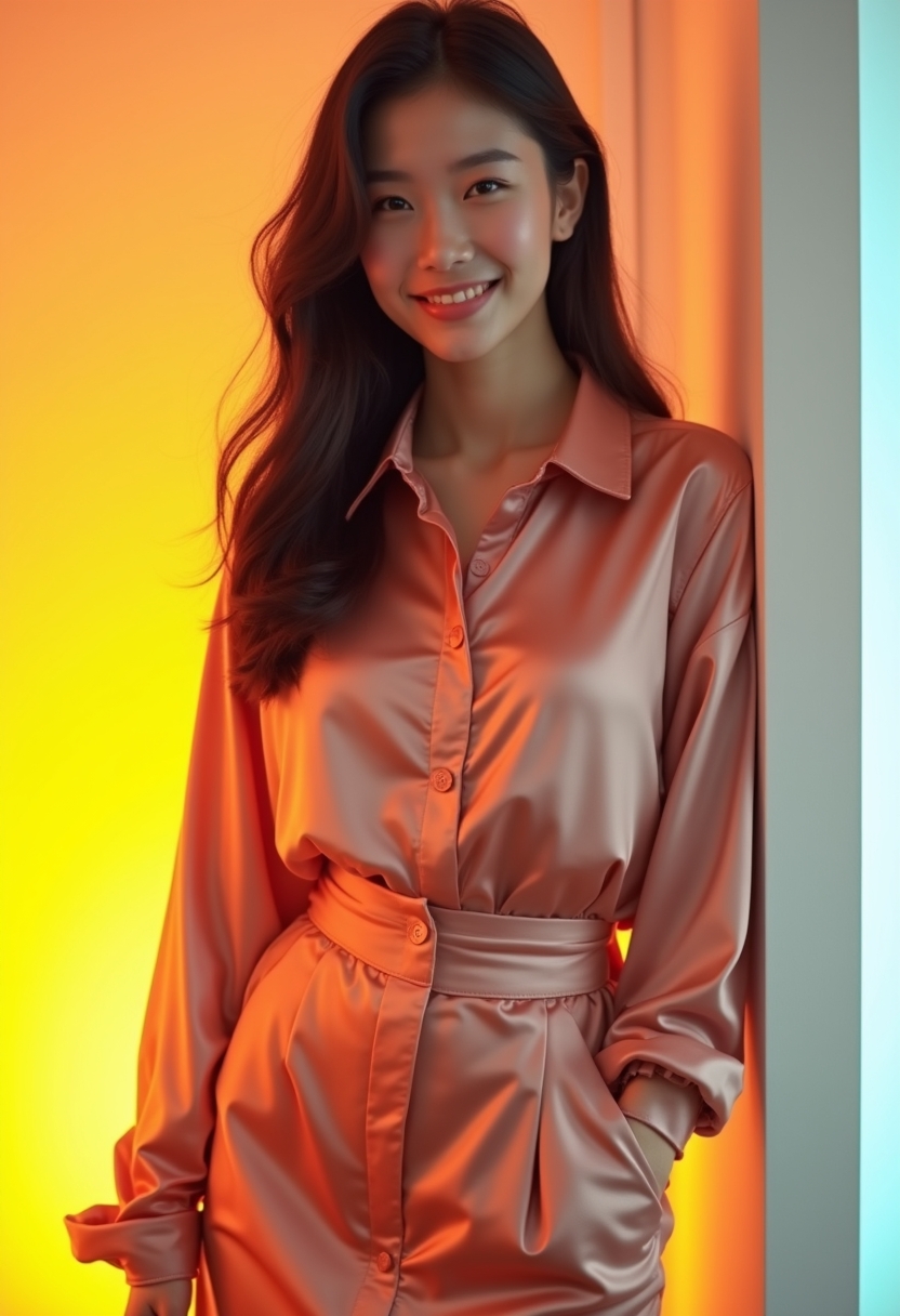 Атлас жейде мен белдемше киген әйел жарқын градиент фонында сенімді позада тұр. Жарық жүзіне бағытталған, көңіл күй ашық.