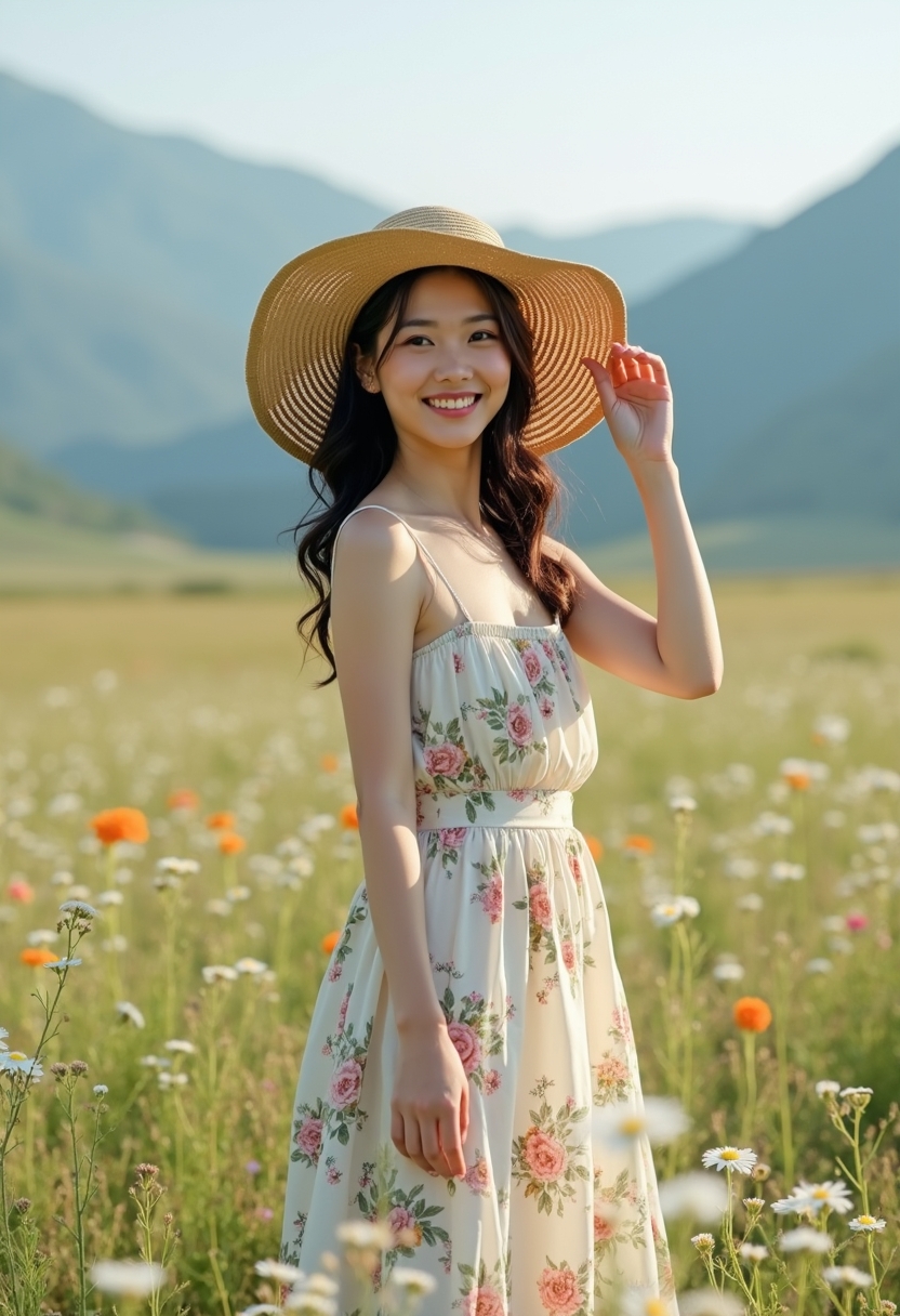 Әйел ашық шалғындықта жеңіл гүлді сарафан киіп, қолында үлкен күн шляпасын ұстап тұр. Ол камераға күлімсіреп қарап, жел бетіне жеңіл тиіп тұр. Артында жабайы дала гүлдері мен тау көрінісі.