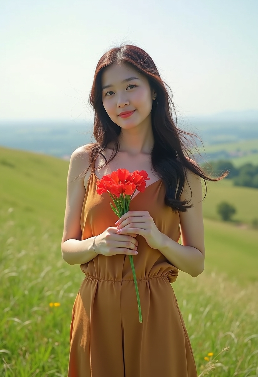 Әйел ашық жасыл шалғынды төбеде жібек түсті комбинезон киіп тұр. Ол қолында қызыл гүл шоғы ұстап, жел бетіне тиіп тұр. Камераға нәзік әрі бақытты көзқараспен қарап, артында шалғын шөптер мен бұлтсыз аспан көрінеді.