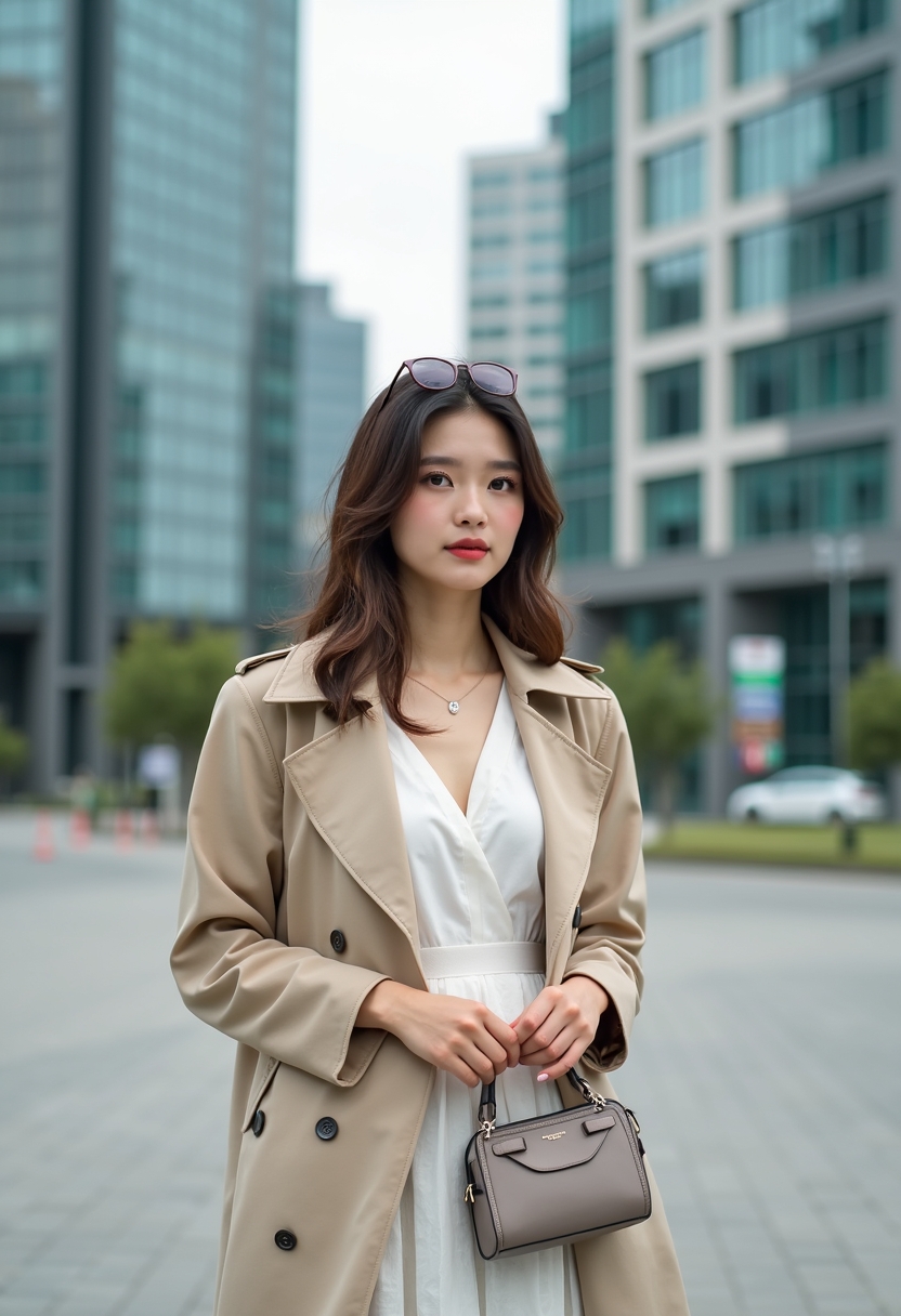 Әйел Астана көшесінде, жоғары әйнек ғимараттардың фонында, нәзік ақ көйлек пен бежевый тренч пальто киіп тұр. Қолында кішігірім қалта сөмке, ал көзінде стильді күннен қорғайтын көзілдірік. Ол камераға сенімді және нәзік көзқараспен қарап тұр.