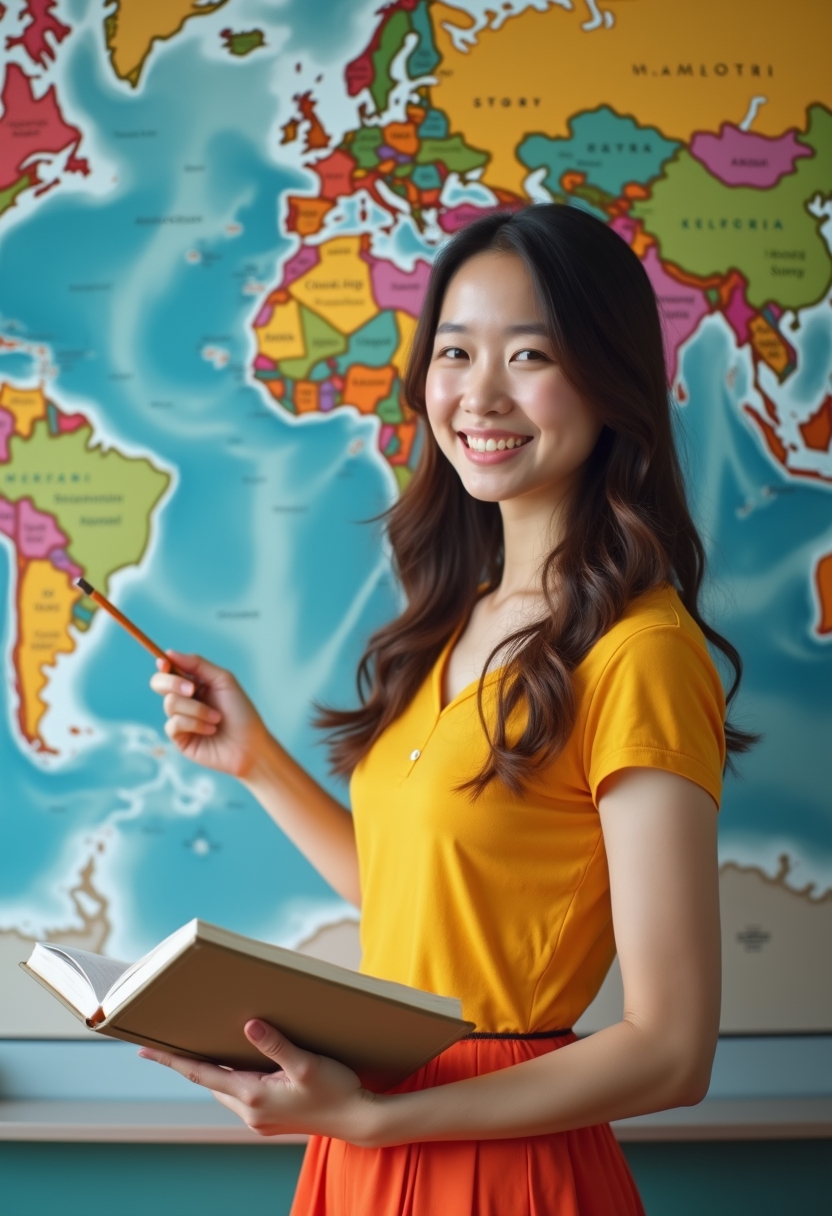 Әйел дүние жүзі картасының жанында ашық түсті көйлек пен юбка киіп тұр. Қолында сілтегіш пен оқулық, камераға жеңіл жымиып қарайды. Жақын жоспар, география сабағының атмосферасын тудырады.