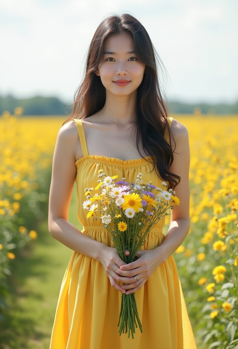 Әйел гүлдеп тұрған шабындықта кең, жеңіл сары көйлек киіп тұр. Ол қолында дала гүлдерінің түрлі-түсті шоғын ұстап, камераға нәзік жымиып қарайды. Артында кең көкжиек пен ашық аспан.