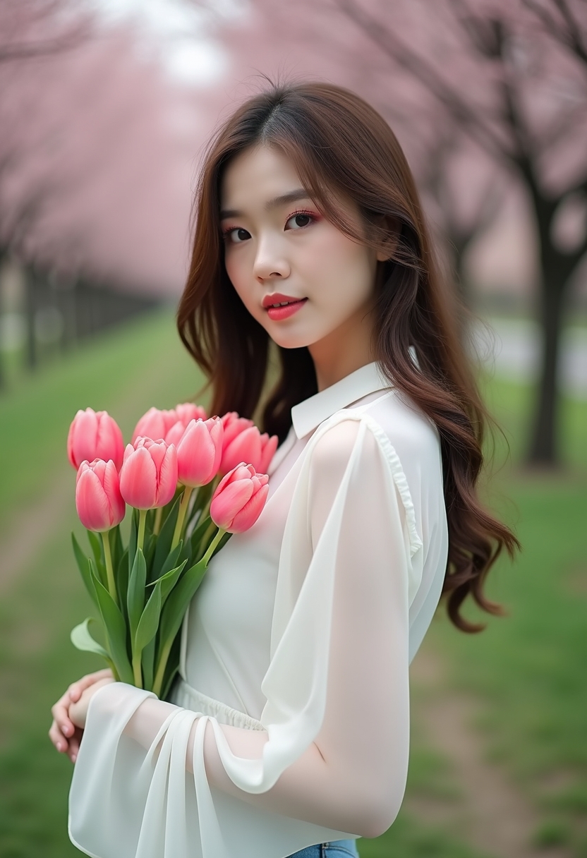Әйел оверсайз свитер мен кең шалбар киіп, қолында нәзік пастель түсті қызғалдақтар шоғы бар. Ол камераға табиғи әрі жылы жымиып қарап, артында ағаштар мен жұмсақ күн сәулесі әсем атмосфера қалыптастырады.