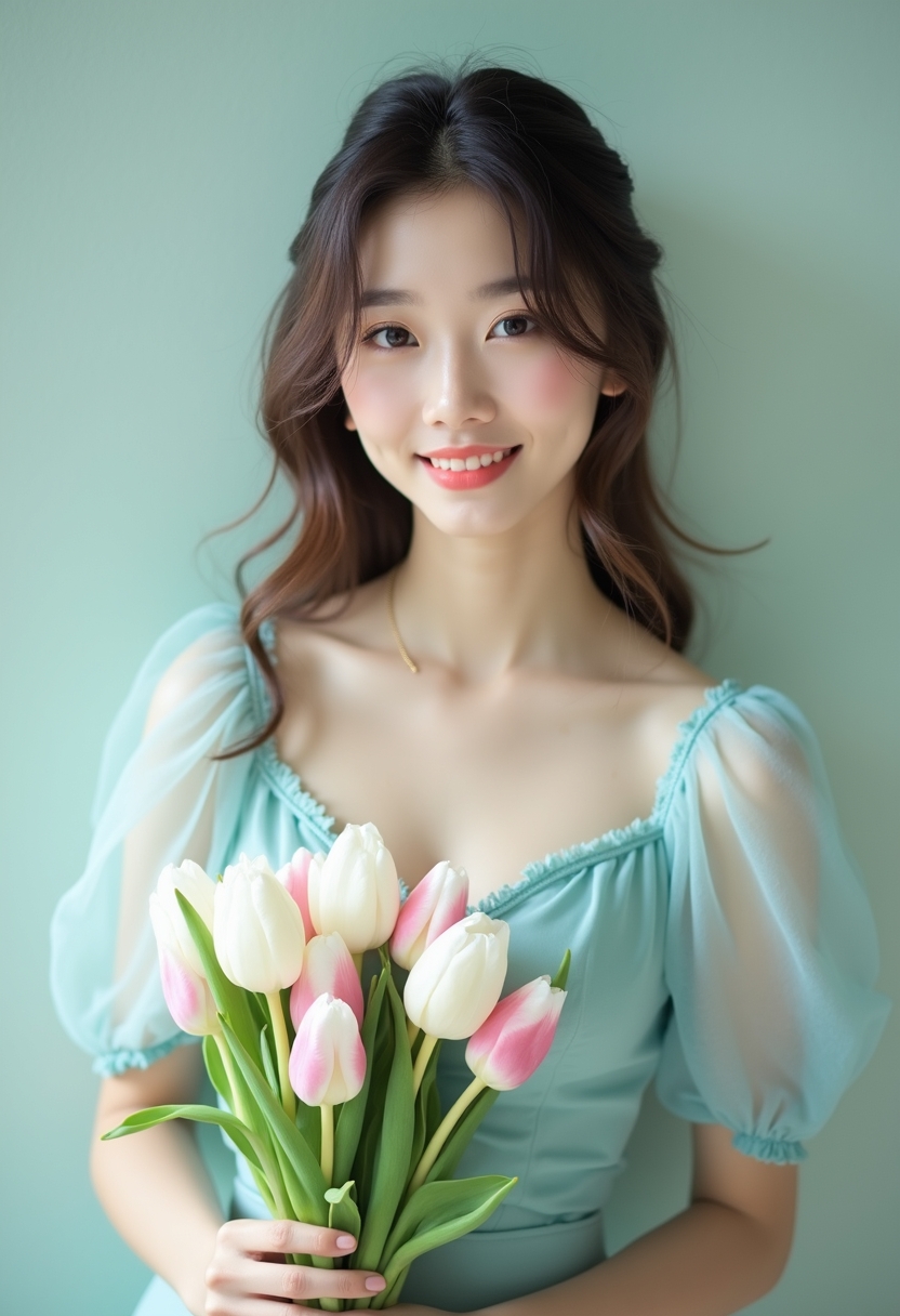 Әйел нәзік көгілдір винтаж стиліндегі көйлек киіп, қолында ақ және қызғылт қызғалдақтар шоғы бар. Ол камераға жылы жымиып қарап тұр. Артқы фон – жұмсақ пастель түсті қабырға, кадр нәзіктік пен талғампаздықты бейнелейді.
