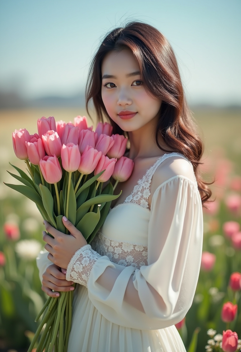 Өз бейнеңізде көруӘйел нәзік кружевамен безендірілген ұзын романтикалық көйлек киіп, қолында үлкен алқызыл қызғалдақтар шоғы бар. Ол камераға армандаған көзқараспен қарап тұр. Артында көктемгі гүлдер мен көгілдір аспан көрінеді.
