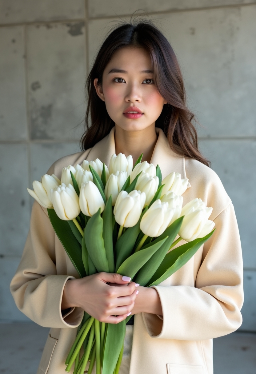 Әйел пастельді пиджак пен классикалық шалбар киіп, қолында үлкен ақ қызғалдақтар шоғы бар. Ол стильді әрі заманауи бейнемен камераға тік қарап тұр. Артында бетон қабырға, урбанистік фон және сәнді әсер береді.
