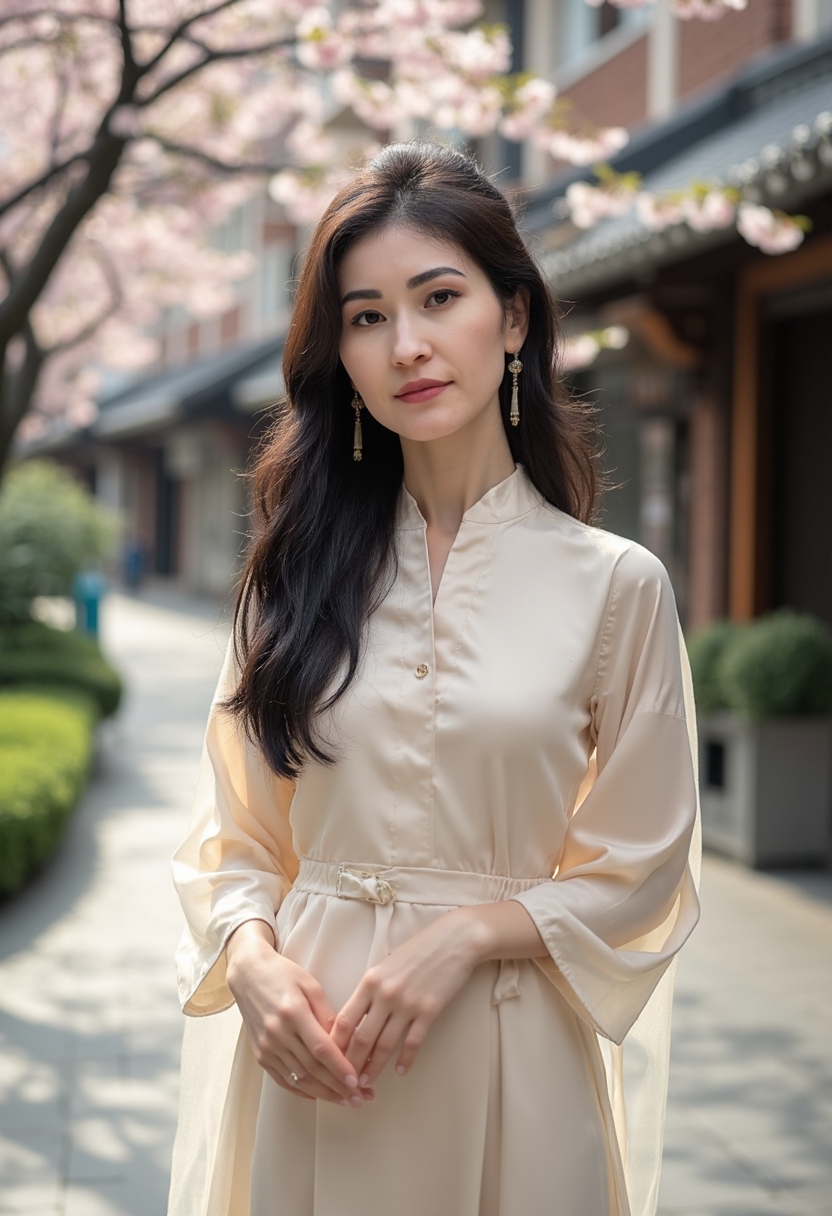 Әйел қаланың сәулеттік ескерткіштерінің бірінің алдында нәзік пастель түсті ұзын қызғылт пальто мен жұқа жібек шарфпен тұр. Астында ақ жейде мен кең ақ шалбар, аяқта ашық түсті бәтеңке. Ол көктемнің жылы желін сезініп, камераға қарайды. Артқы фонда гүлденген ағаштар мен тарихи ғимараттар үйлесім...