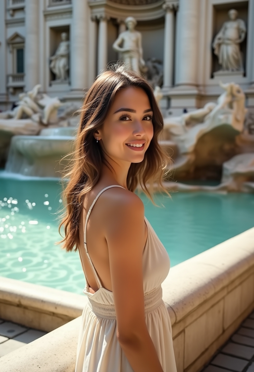 Әйел Римдегі Треви субұрқағының аясында тұр. Ол нәзік түсті, жеңіл жазғы көйлек киген, бұл көйлек оның мүсінін еркін орап, Мәңгілік қаланың атмосферасымен үйлесіп тұр. Шаштары иығына төгіліп тұр, жүзінде — өзіне сенімді күлкі. Күн сәулесі көріністі жарықтандырып, айналасына жұмсақ шапақ береді, ал субұрқақтан ұшқан су тамшылары жылтырап, кадрға серпін қосады. Субұрқақтың тастары мен мәрмәрі тарихи ортаның рухын айқындайды, бұл әйелдің заманауи образына қарсы әсерлі контраст жасайды. Аяқ астындағы еден — Рим көшелеріне тән плиткамен көмкерілген. Кадр ірі жоспармен әйелге бағытталған, ал фондағы субұрқақ бұлдырланып, тереңдік әсерін тудырады.