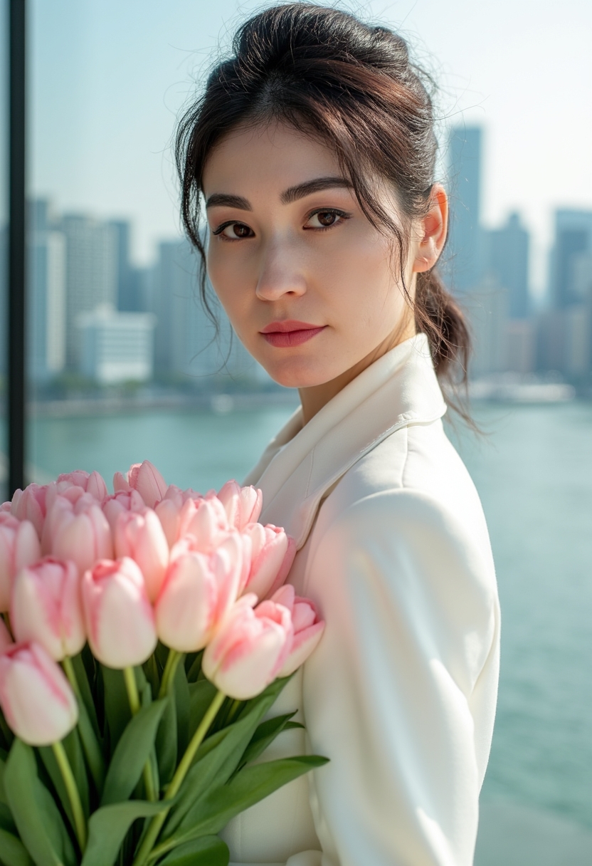 Әйел сәнді ақ костюм мен жібек блузка киіп, қолында үлкен қызғылт және ақ қызғалдақтар шоғы бар. Ол камераға байыпты және сенімді көзқараспен қарап тұр. Фон – урбанистік заманауи қала пейзажы, стильді әсер береді.