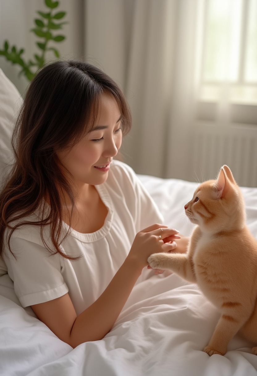 Әйел төсекте жатыр, қолдарын кішкентай қызғылт мысыққа созған, ол қызығып әйелге қарай ұмтылып тұр. Әйел күліп жатыр, ал мысықтың құлағы ойнақтап қимылдайды. Артында терезеден түскен таңғы жарық, күннің шапағатын жеткізеді.