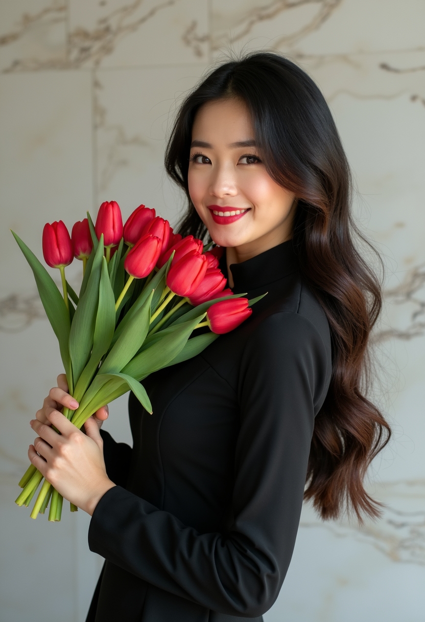 Әйел ұзын жеңді қара классикалық көйлек киіп, қолында қызыл қызғалдақтардан жасалған сәнді гүл шоғы бар. Ол жұмсақ жымиып, сенімді әрі әсем бейнемен камераға қарап тұр. Артқы фон – мәрмәр қабырға, заманауи әрі стильді көрініс береді.