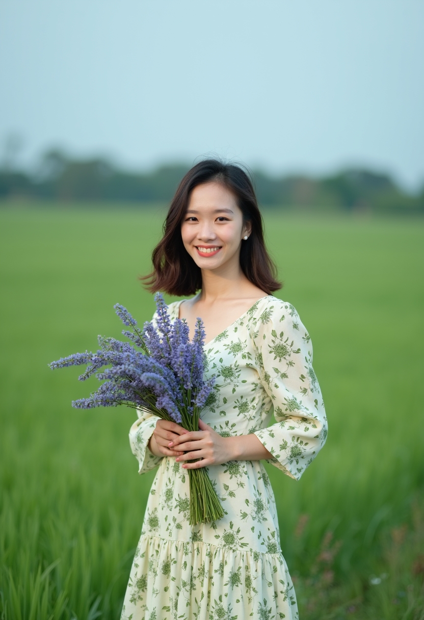 Әйел гүлдеп тұрған шабындықта кең, жеңіл сары көйлек киіп тұр. Ол қолында дала гүлдерінің түрлі-түсті шоғын ұстап, камераға нәзік жымиып қарайды. Артында кең көкжиек пен ашық аспан.