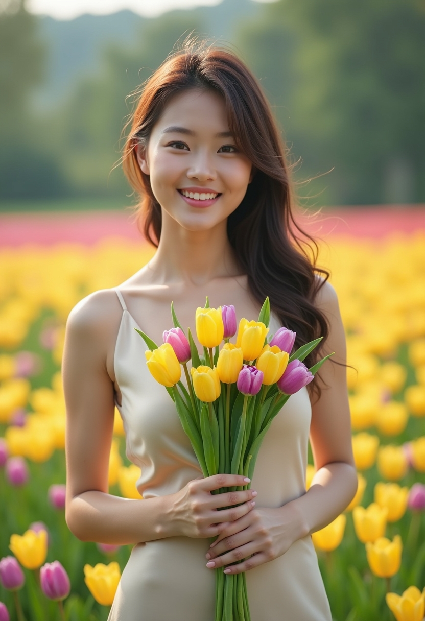 Әйел жеңіл жібек көйлегін киіп, жаздық алаңда тюльпандардың арасында тұр. Қолында сары және күлгін қызғалдақтар шоғын ұстап, нәзік жымиып камераға қарайды. Артқы фонда табиғат көрінісі, көктемгі жылы атмосфера сезіледі.