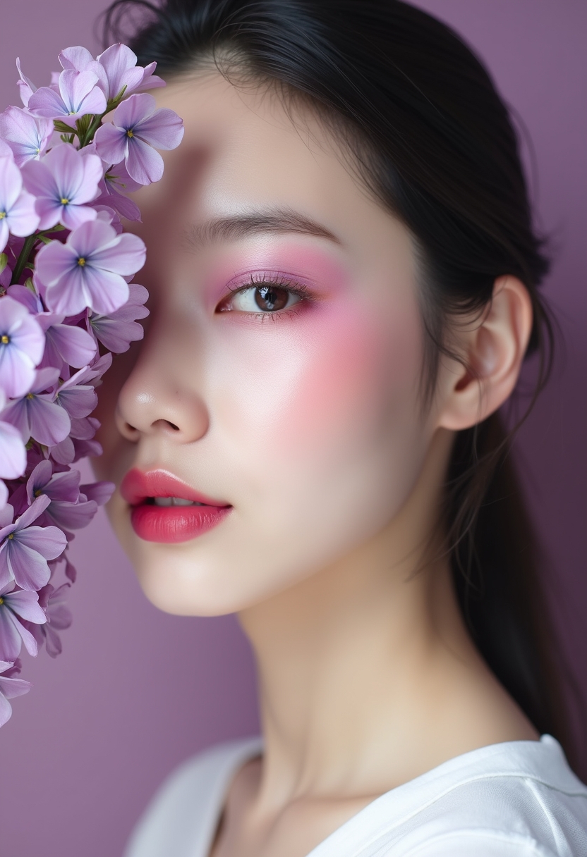 Әйелдің бетінің ірі жоспары. Макияжға ерекше көңіл бөлінген: қабақтарында жұқа ақ сызығы бар лилалық реңді бояу, ал бетінде қызғылт румяна. Терісі жарқыраған, жеңіл ылғалды жылтыр әсері бар. Еріндері нәзік қызғылт түсті. Лилалық гүл шоғы бетінің бір бөлігін жабады. Фон - біркелкі, күңгірт лилалық түсті. Жарық жұмсақ, шашыраңқы, тері текстурасы мен макияж бөлшектерін айқындайды.