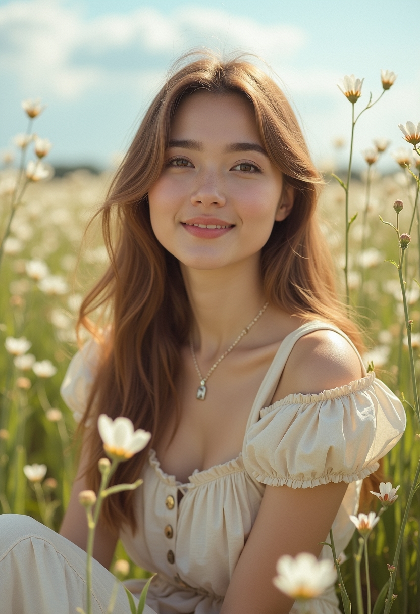 Айқын түс реңктеріндегі полароид стиліндегі фотошежіре: әйел жаздық ашық палитрадағы киім киіп, көктемгі гүлді алаңда отыр. Камераға қараған көзі, жарқын күлімсіреу, күн сәулесінің жұмсақ әсері. Артында жеңіл бұлттары бар ашық көк аспан көрінеді.