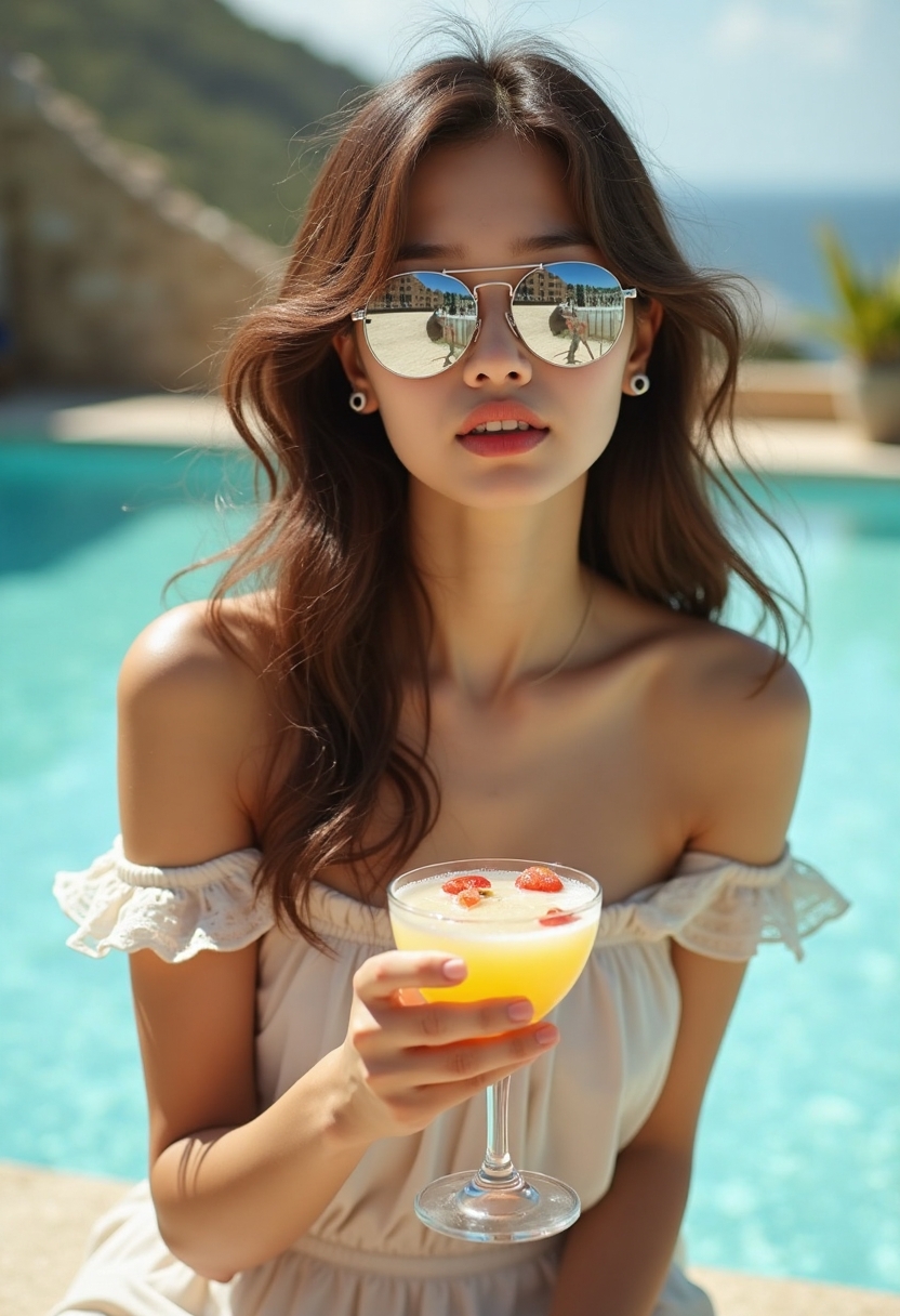 Бассейннің жанына жайғасқан жас әйел, жеңіл мақта көйлек киіп, қолында коктейль ұстап тұр. Оның нәзік толқынды шаштары самал желде тербеліп, көздерінде күннің сәулесінен жарқыраған ашық күміс көзілдіріктер. Камераға қарап әсемдік пен еркіндіктің үлгісі ретінде суретке түсірілген.