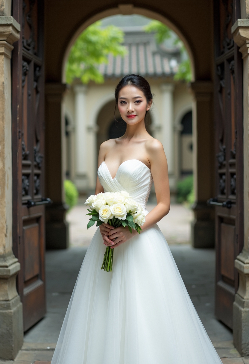 Бел жоғары тігілген ұзын ақ көйлек киген қалыңдық қолында ақ раушан гүл шоғырымен ескі қақпаның алдында тұр. Көзі тура камераға бағытталған, артында көне мекеннің ішкі ауласы. Табиғи жарық, классикалық әсемдікке акцент.
