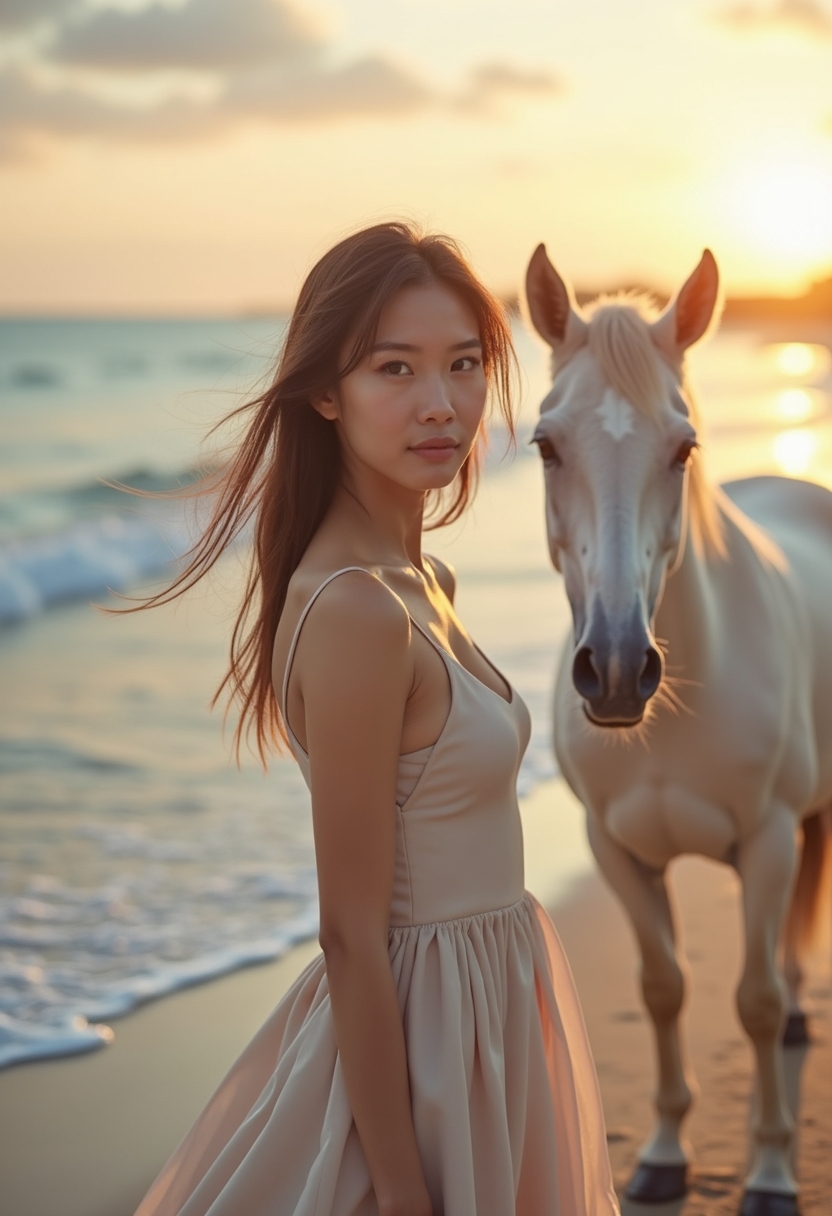 Беліне дейін ашық және етегі қиылған көйлек киген әйел ақ атпен құмды жағажайда тұр. Артында толқындар жағаға ақырын ұрып, күн көкжиекті алтын және қызғылт реңктерге бояған.