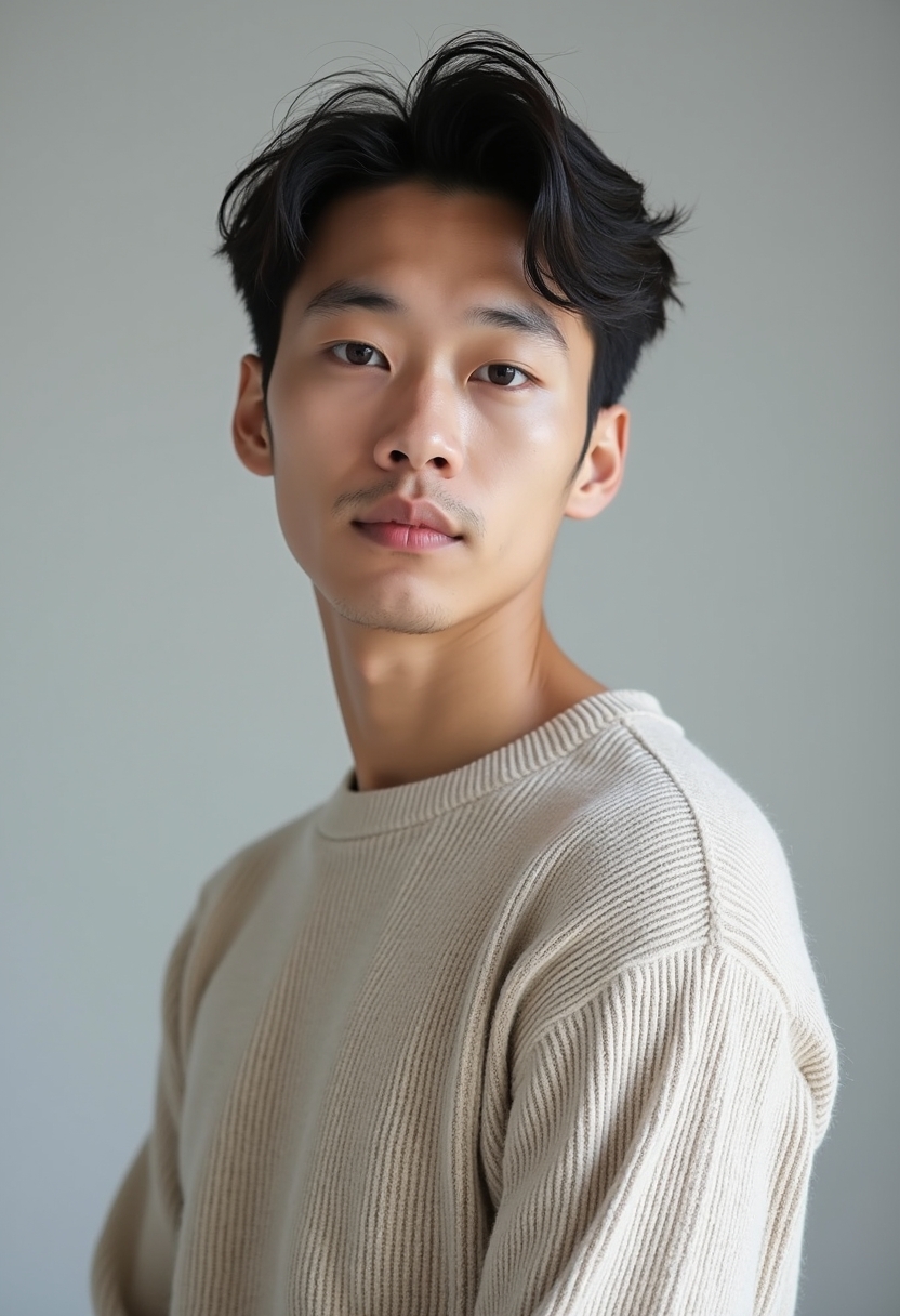 Бейтарап стильдегі сәнді жемпір киген ер адам жұмсақ жарықпен ашық-сұр фонда, тура камераға қарап тұр