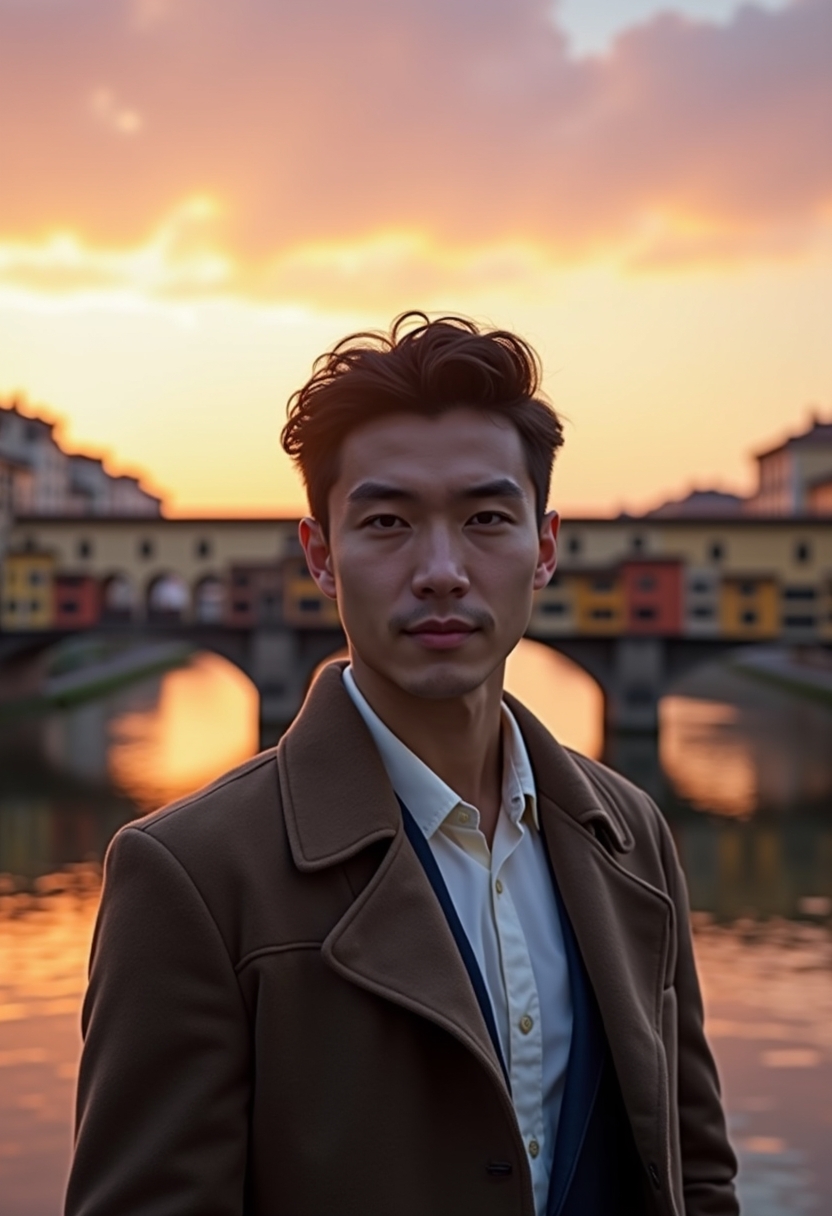 Ер адам, сәнді киім киген, Флоренциядағы Понте Веккьо көпірінің фонында тұр. Ол камераға қарап, күлімдеп тұр. Артқы жағында күн батуы аспанды қызғылт және алтын түстерге бояуда. Өзендегі шағылыстар суреттің сұлулығын арттырып, романтикалық атмосфераны күшейтеді.