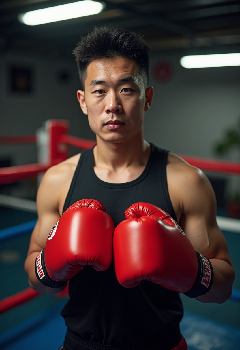 Бокс қолғаптарын киген ер адам ринг бұрышында тұр, тура камераға қарап тұр, артында залдың көмескі шамдары
