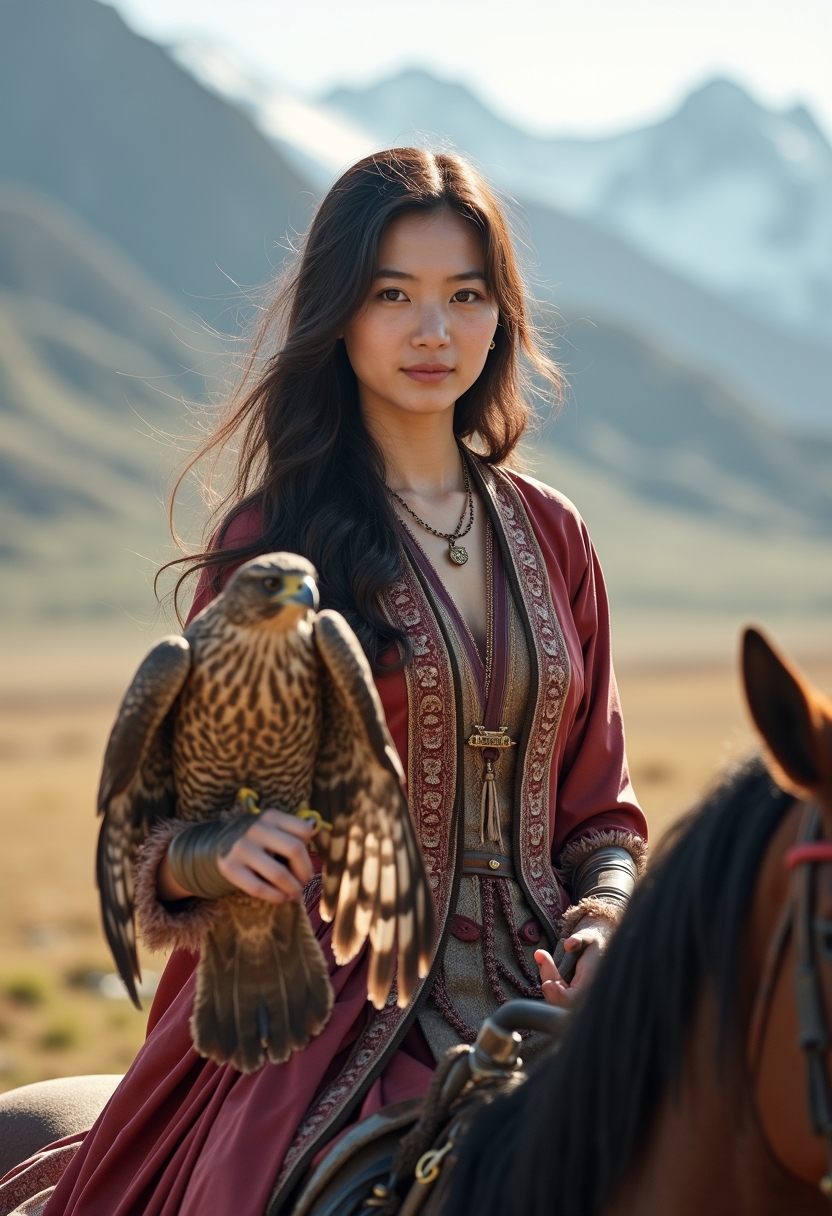 Далада ұзын жібек көйлек пен әшекейлі камзол киген қазақ қызы атқа мініп отыр, оның қолында бүркіт бар. Ол тура камераға сенімді түрде қарап тұр, ал артында шексіз дала мен қарлы шыңдар көрінеді. Күннің жарығы оның жүзіне нәзік жылулық сыйлап тұр.