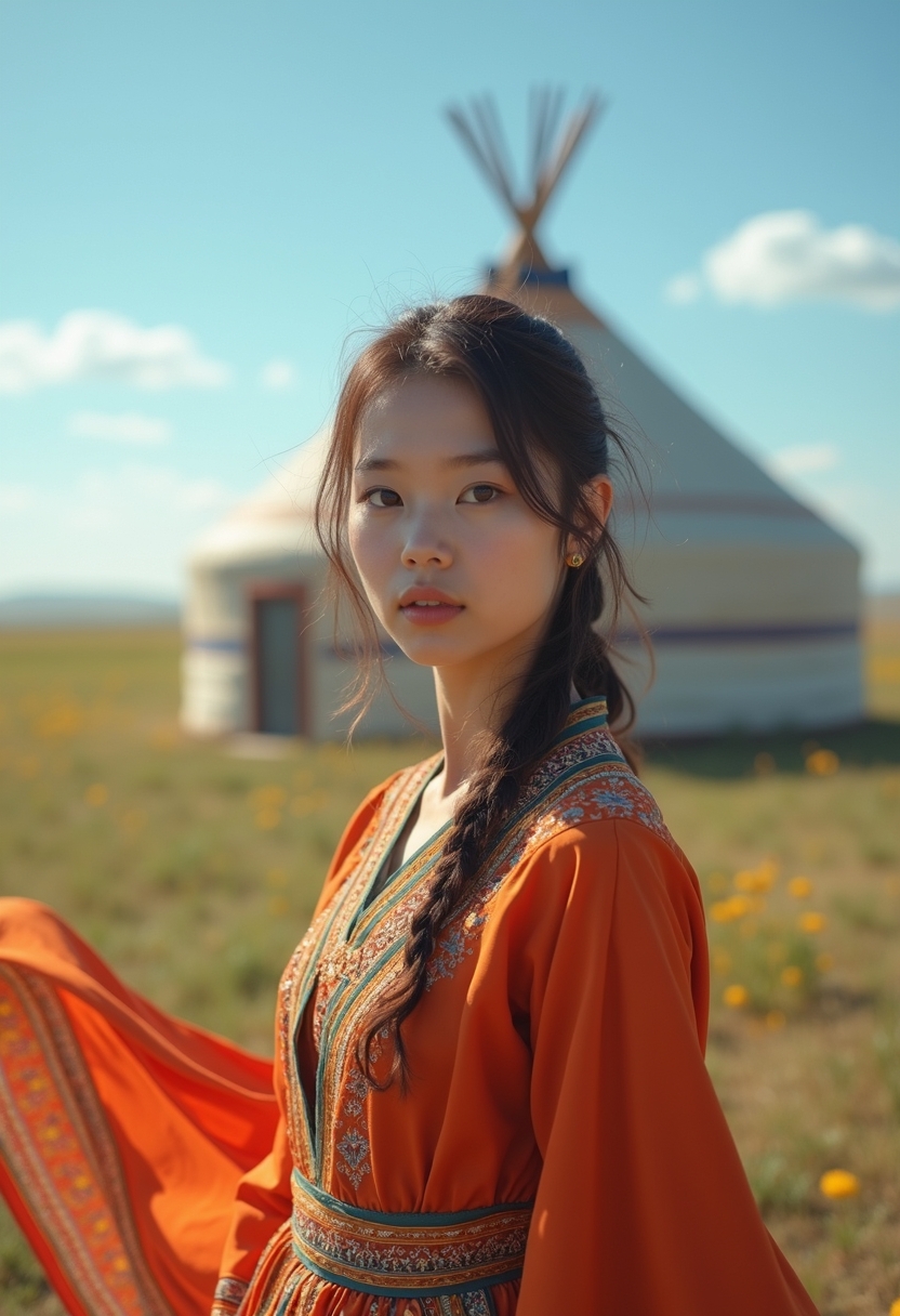 Даланың ортасында киіз үй жанында, дәстүрлі киім киіп, көк аспан астында тұрған адам. Жібек желкесін самал жел тербеп, ол камераға тіке қарап тұр. Айналадағы кең жазық дала мен шаңған дала гүлі көрініп тұр, табиғаттың мәдениет үйлесімі байқалады.