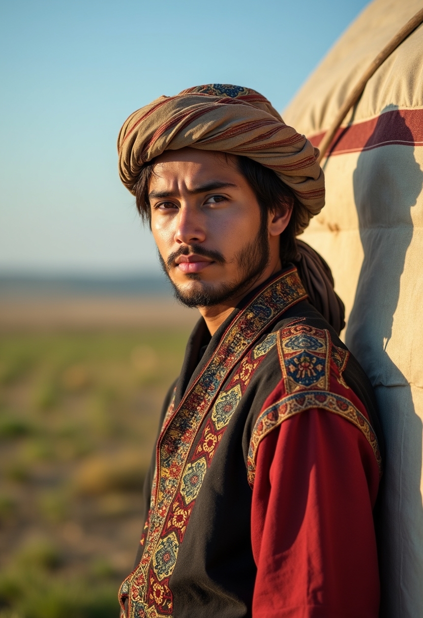 Дәстүрлі киіз үйдің жанында көне нақышты шапан киген жас жігіт тұр. Оның басында оюлы тақия, көзі тікелей камераға бағытталып, байсалды әрі мақтанышпен қарауда. Айналасында кең дала, көгілдір аспан мен жасыл өсімдіктер табиғи сұлулықты айшықтайды. Табиғи жарық оның қас бетін нәзік жарықтандырып, ұлттық рухпен толықтырады.
