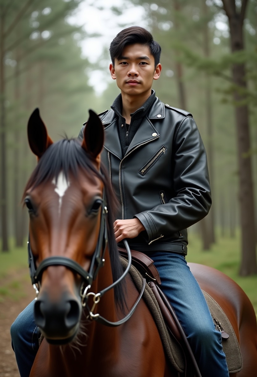 Джинсы мен былғары күртеше киген ер адам орман ішінде атқа мініп отыр, тура камераға қарап тұр.