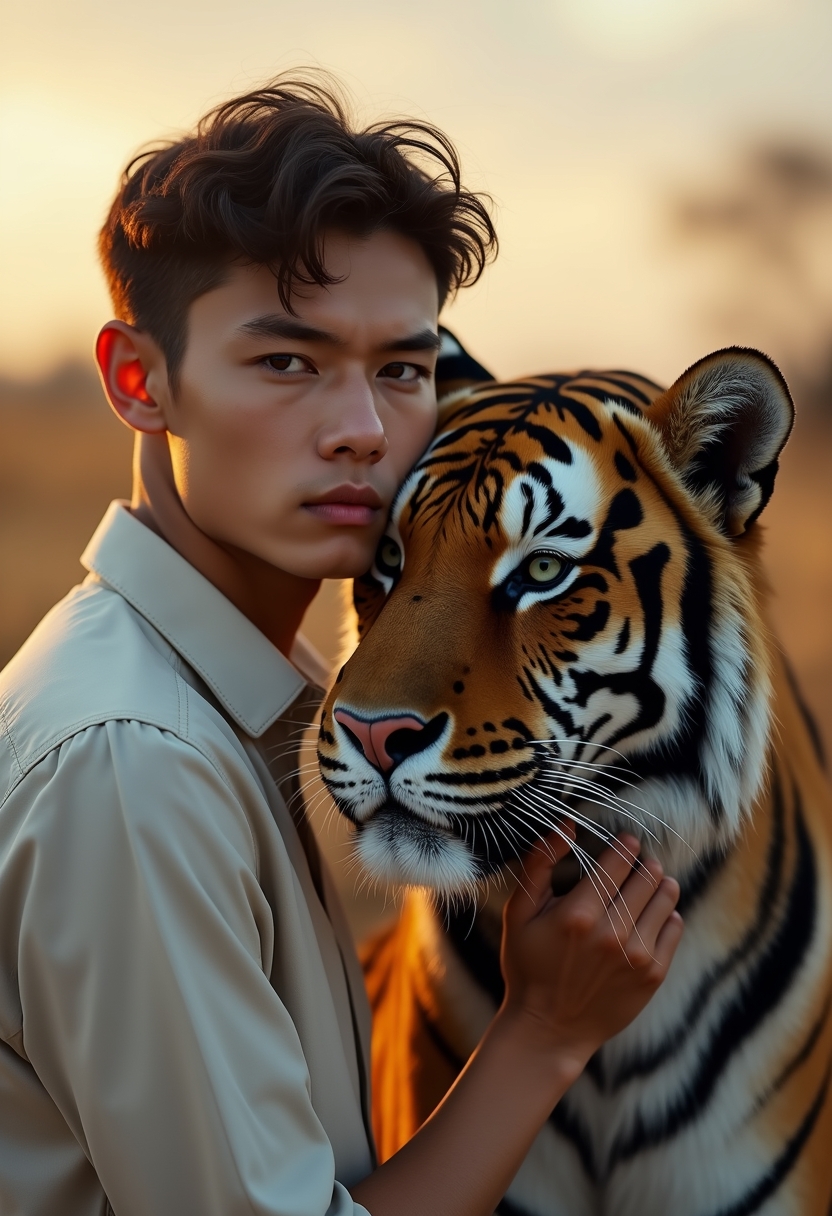 Ер адам қабыланмен қатар тұр, оның қолы жыртқыштың дақты терісіне тиіп тұр. Ол камераға байыпты кейіппен қарап тұр, ал қабылан көзін сығырайтып алыстан бақылап тұр. Артында саванна, жұмсақ кешкі жарық адам мен жыртқыш арасындағы контрастты көрсетеді. Жақын план.