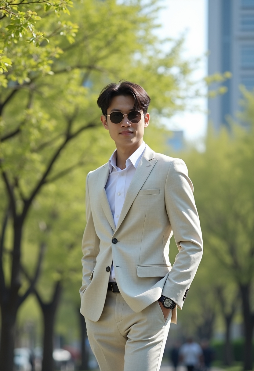 Ер адам қалалық саябақта көктемгі жапырақтар арасында жайбарақат жүріп келеді. Ол жеңіл льняной костюм мен ақ жейде киген, күннен қорғайтын көзілдірігі стильді көрініс береді. Артқы фон жасыл ағаштар мен заманауи ғимараттар үйлесімімен көмкерілген.