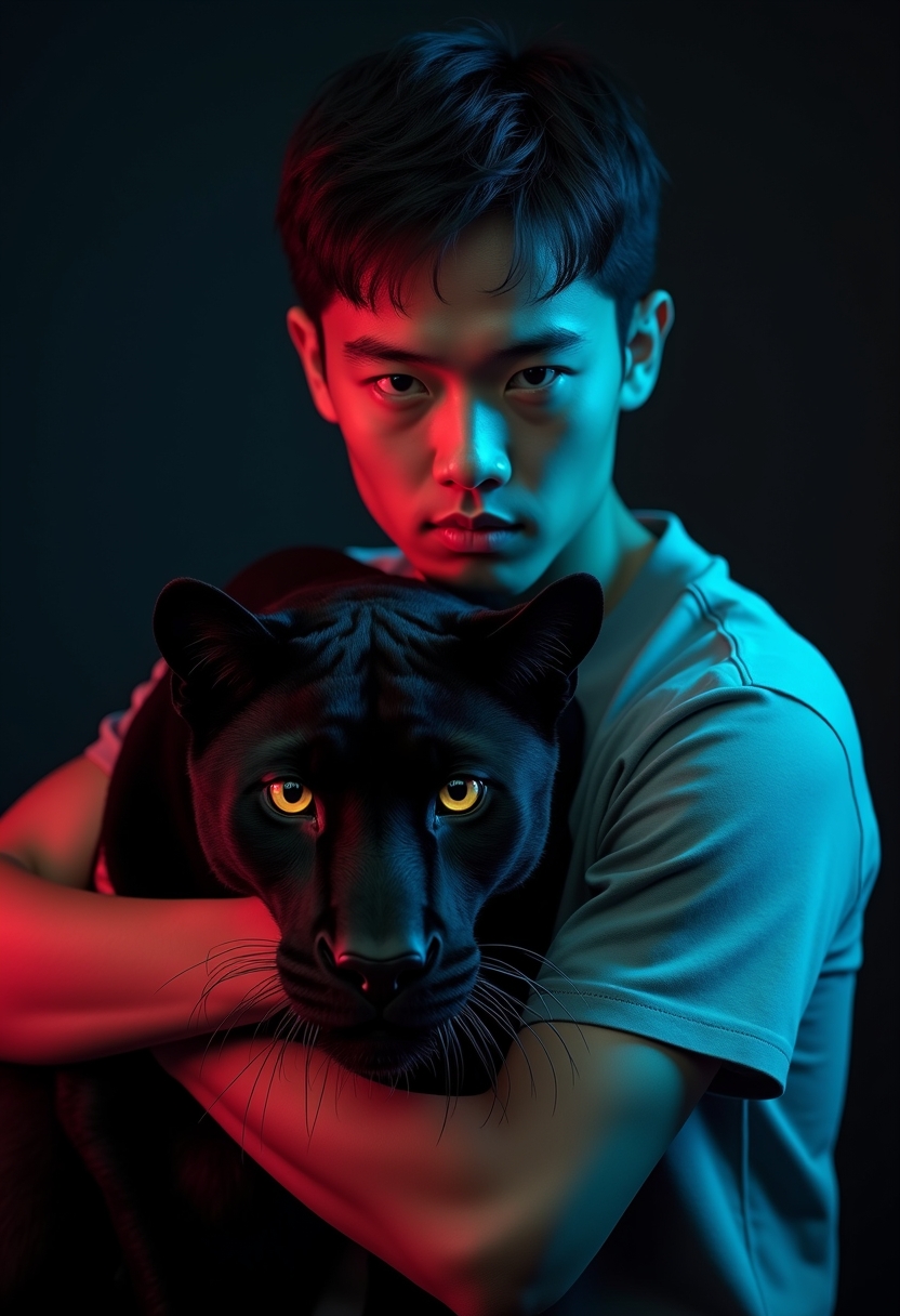 Ер адам қара пантераның жуан мойнынан ұстап тұр, оның жүзі жұмсақ неон жарығымен ішінара жарықтанған. Жыртқыш тура камераға қарап, алтын түсті көздері қараңғыда жарқырап тұр. Артында минималистік қара фон, жұмсақ жарық құпия атмосфера тудырады. Жақын план.