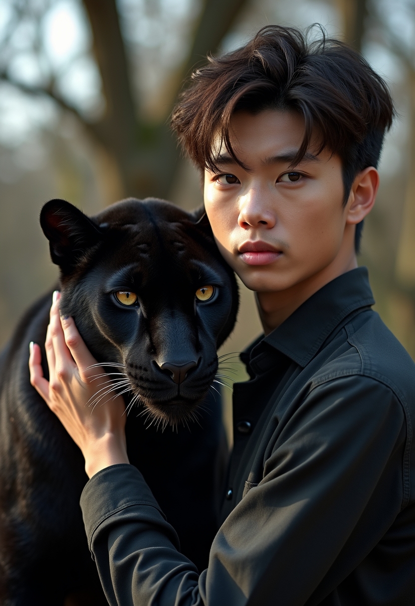 Ер адам сымбатты пантерамен қатар тұр, оның жүзіне контрастты жарық түсіп тұр. Ол қолымен пантераның арқасына жеңіл тиіп, камераға сенімді түрде қарап тұр, ал пантера алыстан бірдеңені бақылап тұр. Артында бұлдыр ағаштардың көлеңкесі. Жақын план.
