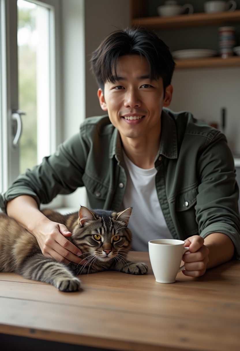 Ер адам үстел басында отыр, ал оның алдында ағаш үстелде үлкен мейн-кун мысығы керіліп жатыр. Ол бір қолымен кофе ұстап, екінші қолымен мысықты басынан сипап отыр. Артында заманауи ас үй интерьері, табиғи күндізгі жарық.